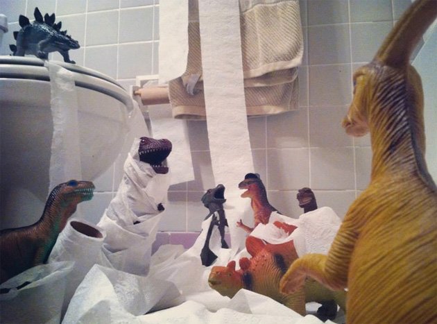 Está muy bien que sean educados y vayan al baño, pero ¿era necesario gastar tanto papel higiénico? el tiranosaurio rex parece la momia de Tutankamón !!!