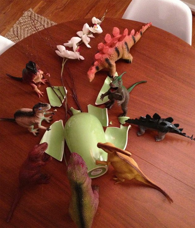 Y claro, con tanto dinosaurio enorme, tanto cuerno, tanta púa y tanta cola, es imposible no romper algo … ups!