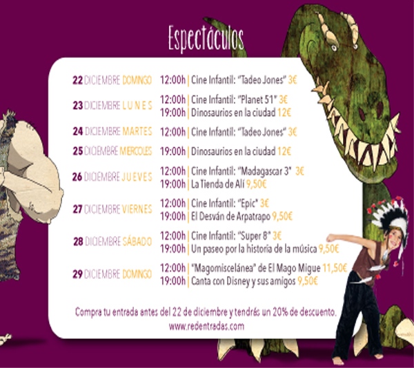 Disfruta con los distintos espectáculos programados (precio según espectáculo): Tadeo Jones, dinosaurios, Planet 51, Madagascar 3, Epic, Super 8 y muchas cosas más.